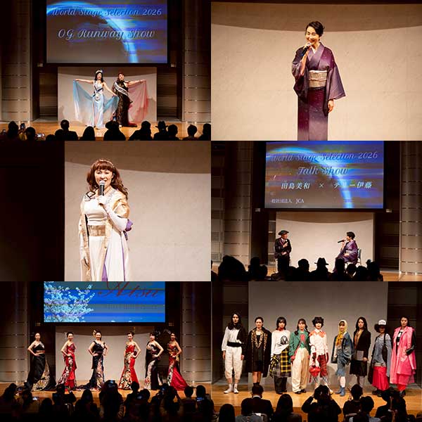 2026年4月18日(土)東京ウィメンズプラザホールにて、JCA主催のWorld Stage Selection 2026が開催されました。3つのアバンギャルドファッションブランドによるファッションショーから始まり、続いて和ドレスのランウェイと華やかなステージが観客を魅了しました。選考会を挟んでJCA代表理事の田島美和とTVプロデューサーのテリー伊藤氏によるトークショーで会場を盛り上げ、メゾソプラノ歌手の長谷川智子さんの歌を観客は聞き入っていました。